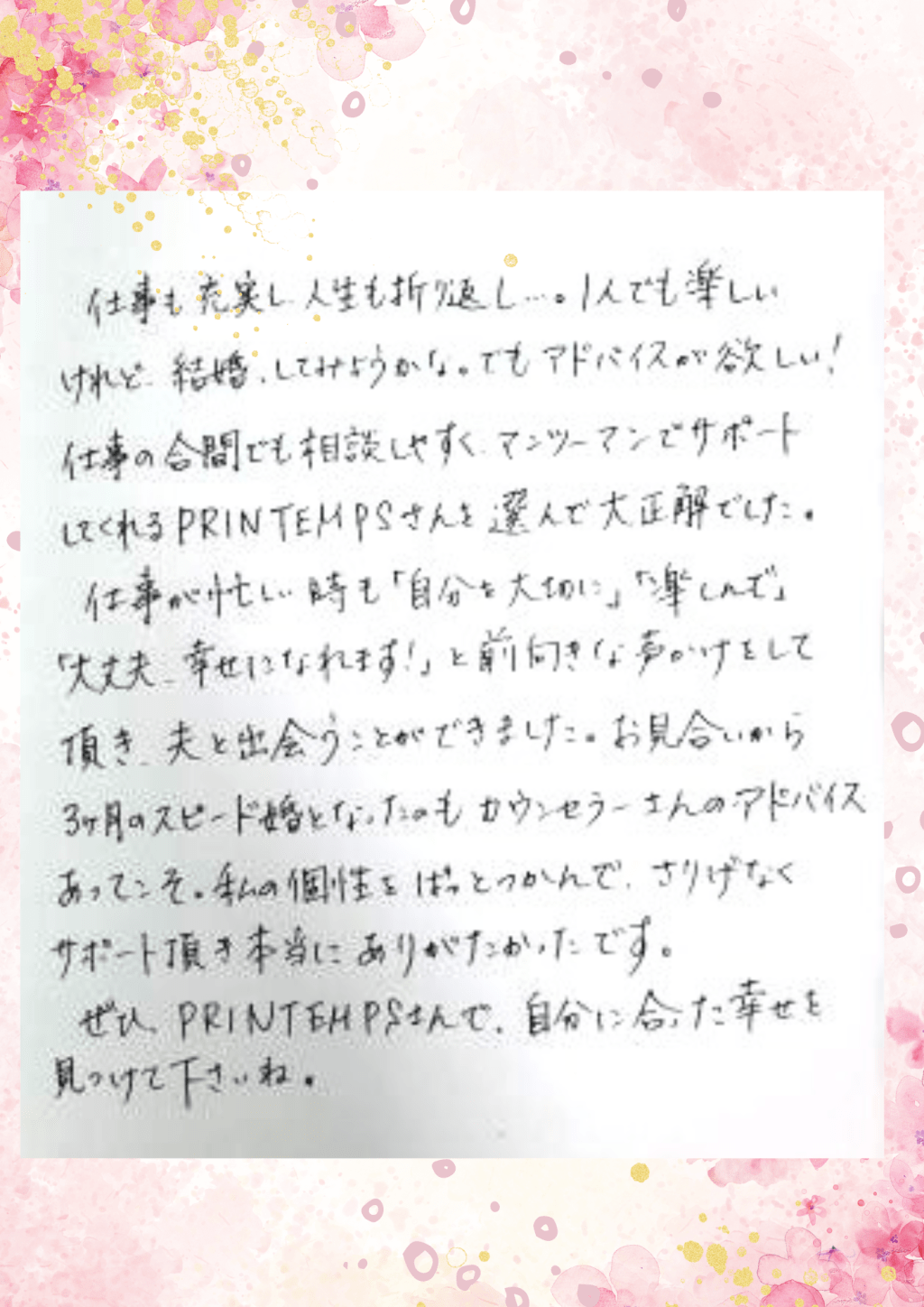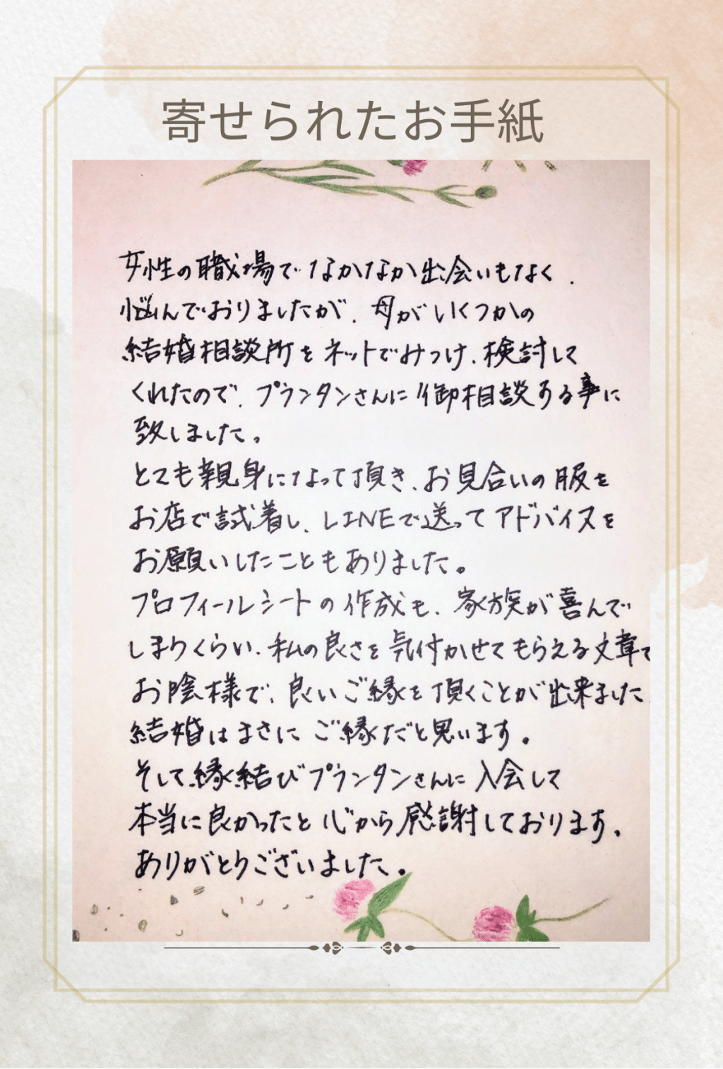 ご成婚の折の会員様の喜びの笑顔があるからこそ、このお仕事を続けてこられたと感謝しております。親御様から『プランタンさんとの出会いが私にとっては常に支えになっておりました』と言っていただくと、仲人冥利に尽きます。理想のお相手とご成婚できますよう一緒に進めていきましょう。